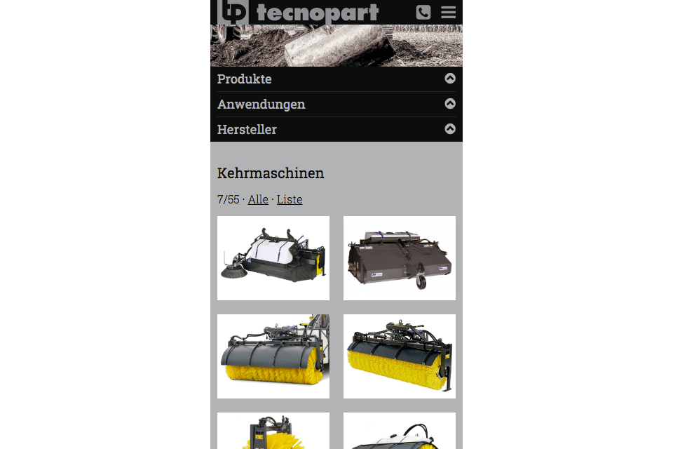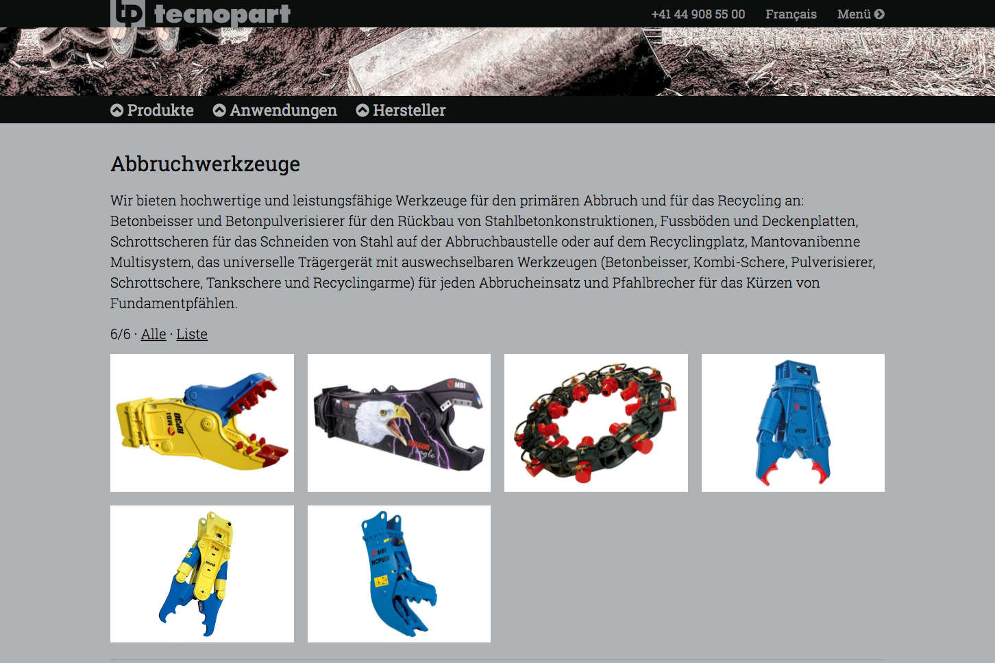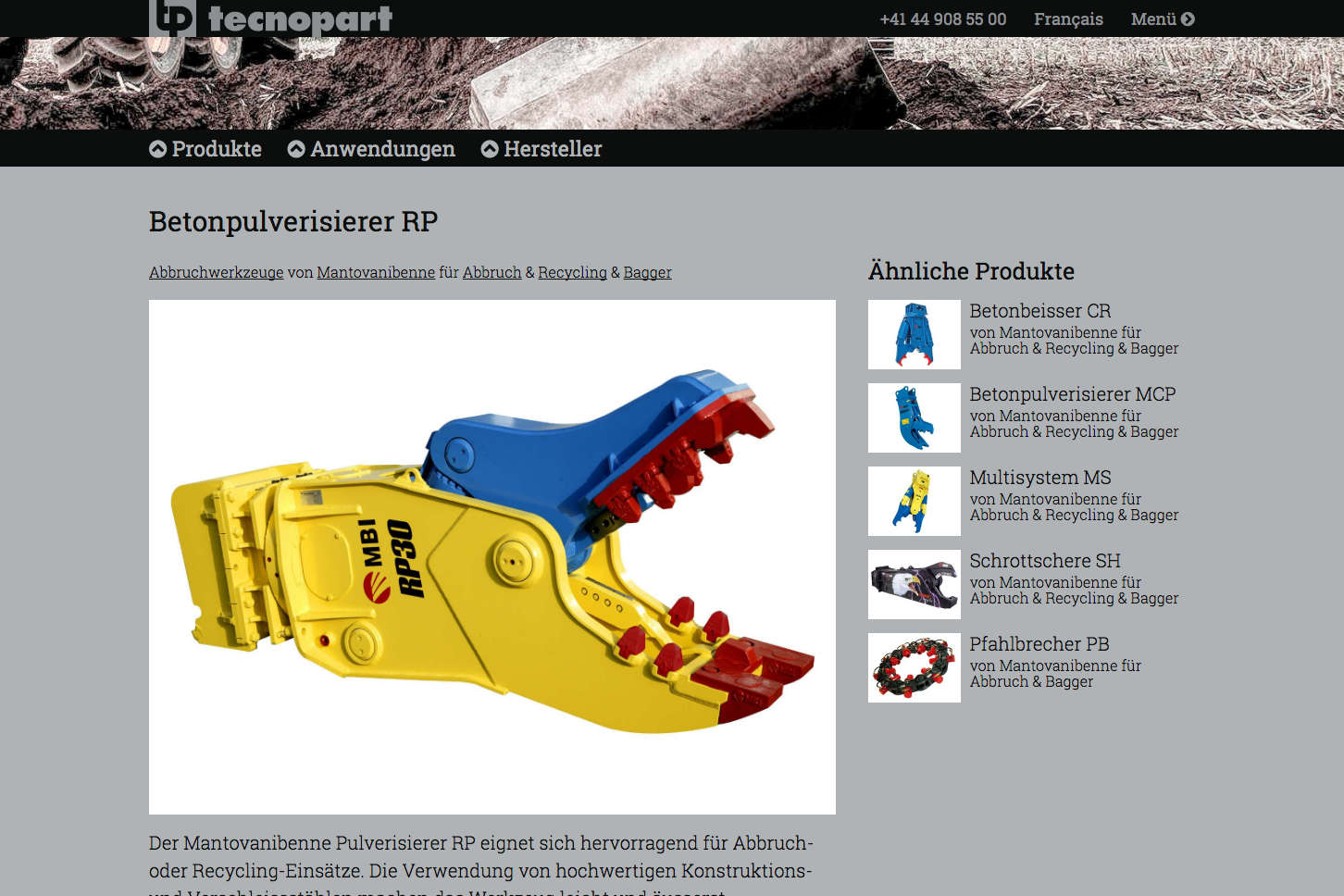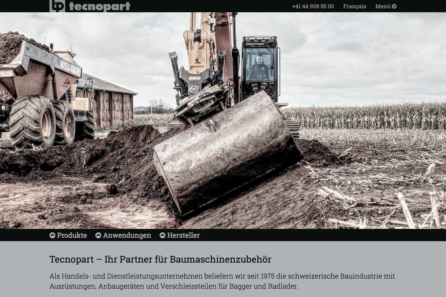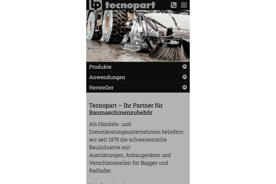 Corporate Website für Tecnopart AG, Baumaschinenzubehör für Bagger und Radlader.